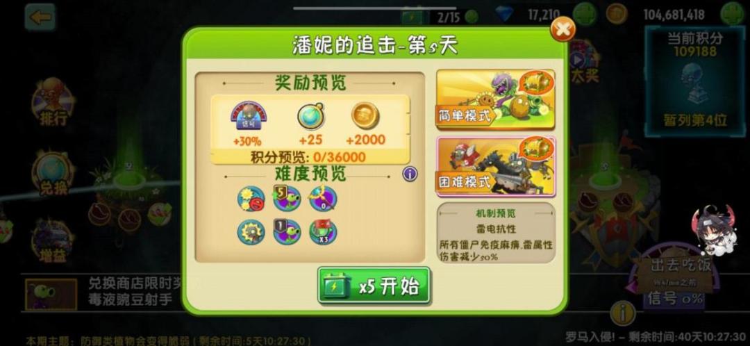 目前的第五关有两个难度:简单难度与困难难度。两个难度的出怪相同,单纯阶数不同;简单模式僵尸为全一阶,困难模式则是2-6阶不等。简单模式的计分方式为:12000-10*t(t为通关需要的时间,下同),起始阳光为300;困难模式的计分方式为:36000-30*t,起始阳光为150。