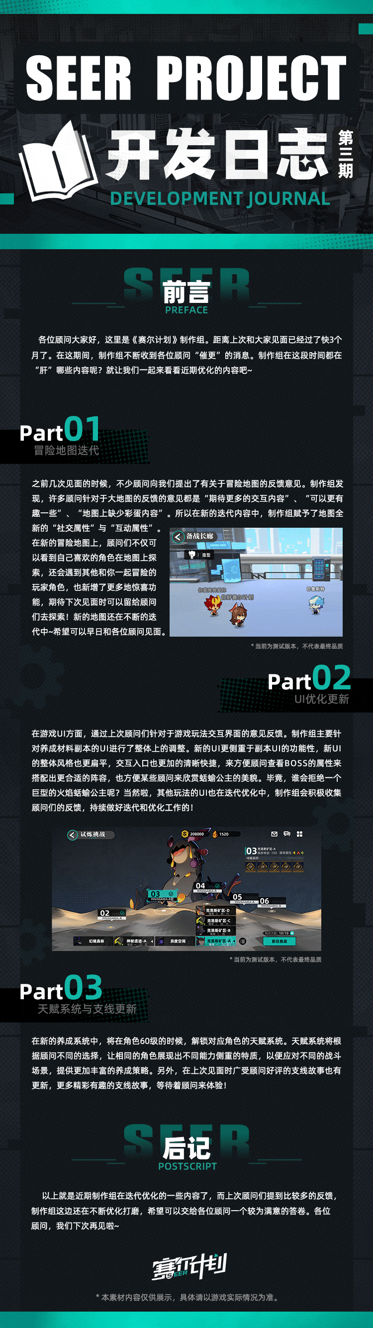 各位顾问们好!距离上次和大家见面已经快过去三个月啦~这期间制作组“肝”了许多内容,想要第一时间跟大家分享——冒险地图中新增了许多彩蛋,新的UI界面更加美观快捷,天赋系统的更新也将会为顾问们带来更加自由丰富的养成策略体验......现在让我们一起看看有关开发进度的更多信息吧!