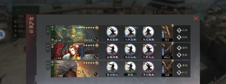 3、赵云属于有啥用啥,兵无万金油战法,不过这次改版要削弱了,没有击势的话,兵无换愈战愈勇也可以,这里注意,如果赵云不给兵无,那么貂蝉需要带避其,形成双减,防止被爆头。
