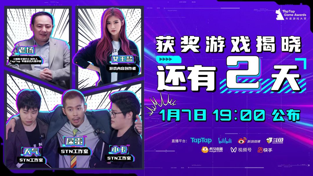 倒计时2天!1月7日19:00,即将公布2022最受欢迎的游戏到底是谁~在TapTap、bilibili、微博、虎牙、斗鱼、微信视频号、快手平台直播,记得锁定~