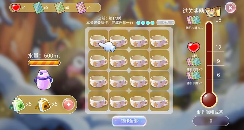 进入第一关,根据通关条件点击茶杯制作热饮。例如图中需要完成横向四杯热饮,那么点亮任意一行的四杯即可过关。