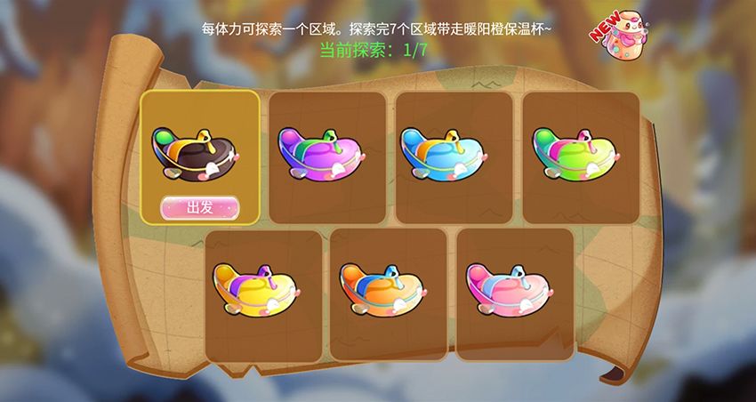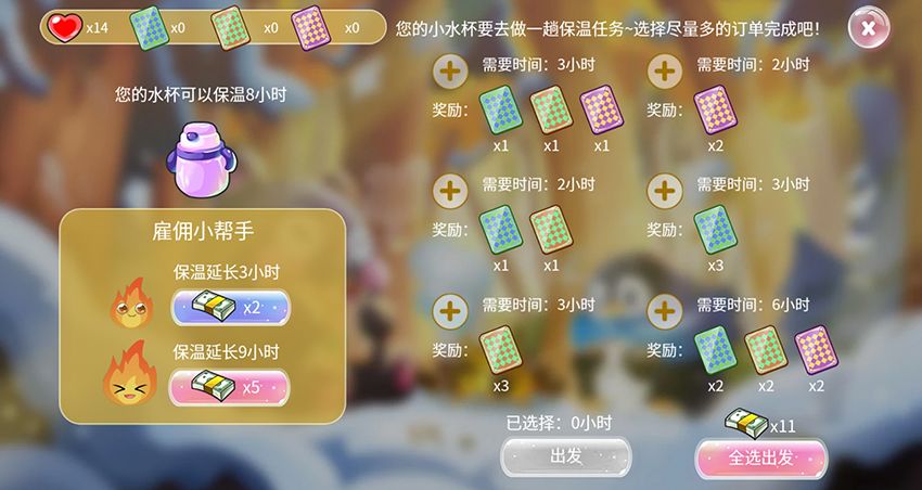 进入下一关前,让小水杯完成一趟保温任务吧,点击右侧任务选中后点击出发,即可领取对应的卡牌啦~