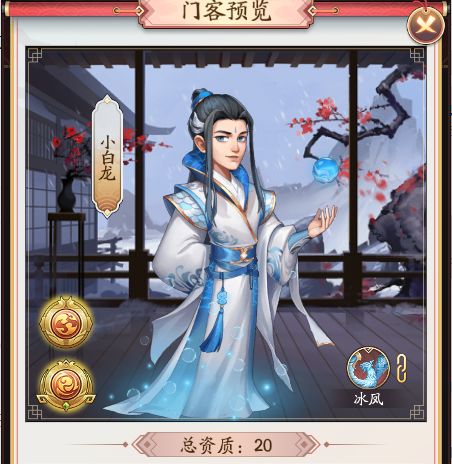 今天我们来介小白龙这个门客,传说中的神话人物,小白龙就是白龙马的人身。他的初始总资质是20。接下来我们就一起来看看有那些属性吧