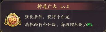 第二个技能,神通广大,每升1级会提升小白龙百分之8的财力值,升级是要消耗10个西行令的,西行令就是兑换西游传说门客的道具10个可以换一个门客,应该先全部兑换激活百分之65之后在去看要不要升级这个技能,一级之增加百分之8少太多了。