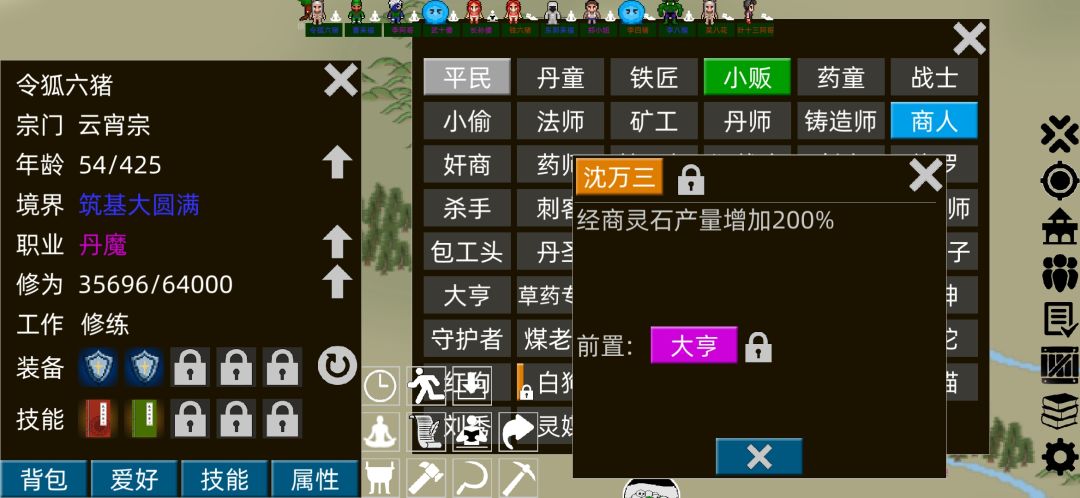 初始弟子,第一个选择交易值高且乐意交易的(红色火焰代表喜欢,越多越好),最好修炼也能高一些,毕竟境界高了跑的快一些比较舒服。职业无所谓,商人最好。(沈万三和大亨最高难度被禁用,只能到商人)