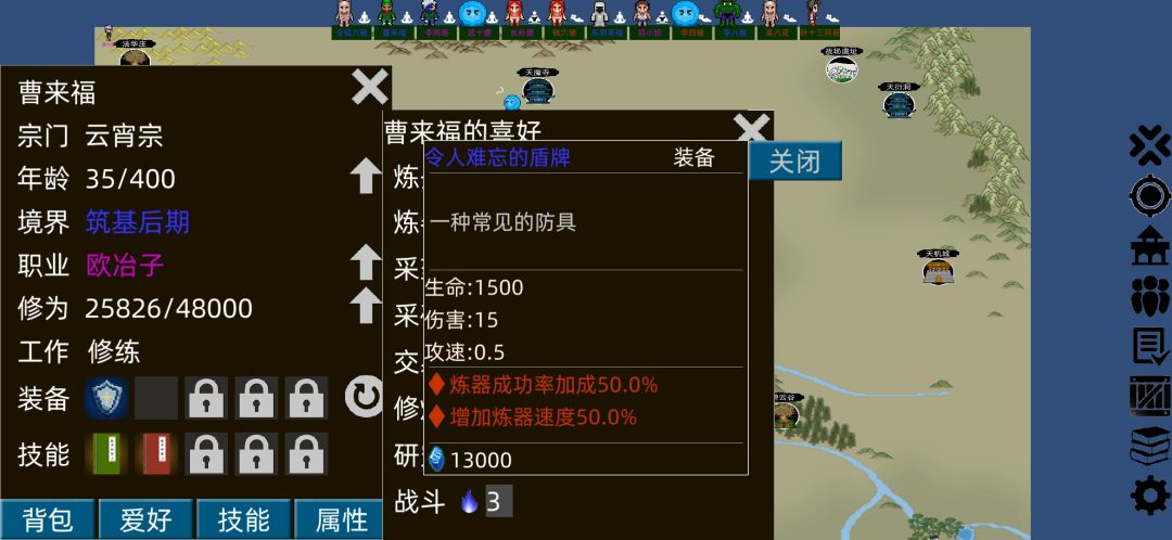 我们速通的方法,是只培养一名主力弟子,靠他砍天砍地。当然,招募来的元婴金丹弟子还是要给装备领悟功法的。解释一下为什么不直接培养招募的元婴弟子,因为他们一般寿命用去太久,看着不舒服