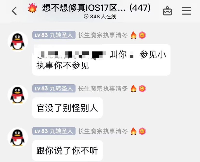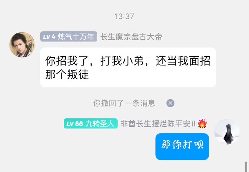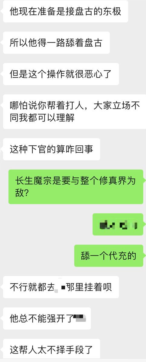 其中某位玩家加入长生魔宗之后,自称“执事”,该玩家本来是区内不知道T多少的真诀,自从入宗后便开始膨胀起来,不仅对之前给他官的陈平安大放厥词,还让长生魔宗的“宗主”、“副宗主”下普通玩家的官职,某真诀玩家只是想找个更好的天尊,就被此人疯狂针对,而后盘古更是亲自下场,称那位找官的玩家为叛徒,并开始疯狂59他人,非“魔宗”玩家均遭荼毒: