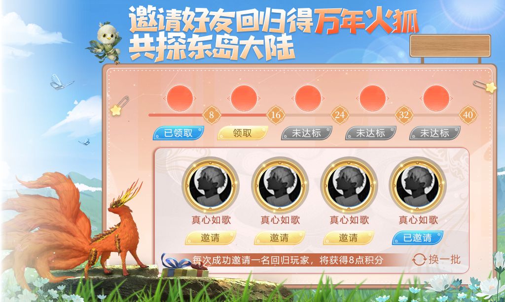 2023年1月6日更新后-2023年1月16日活动期间,旅者可通过邀请流失旅者(流失14天以上的玩家)获得活动进度积分,积分累计到一定值即可解锁对应幼兽自选礼盒、邪巫密卷、万年火狐礼盒等进度奖励!