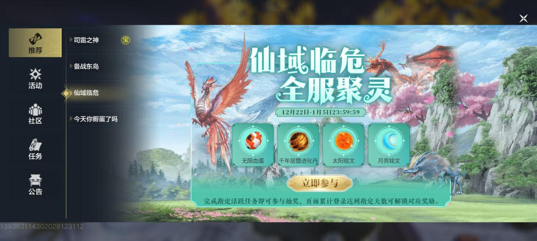 全民孵蛋:2022年12月22日-2023年1月15日,旅者完成相应任务即可获得穷奇本体自选包、千年进化丹、宠物临时卡、化育丹、3级生命技能书等好礼。