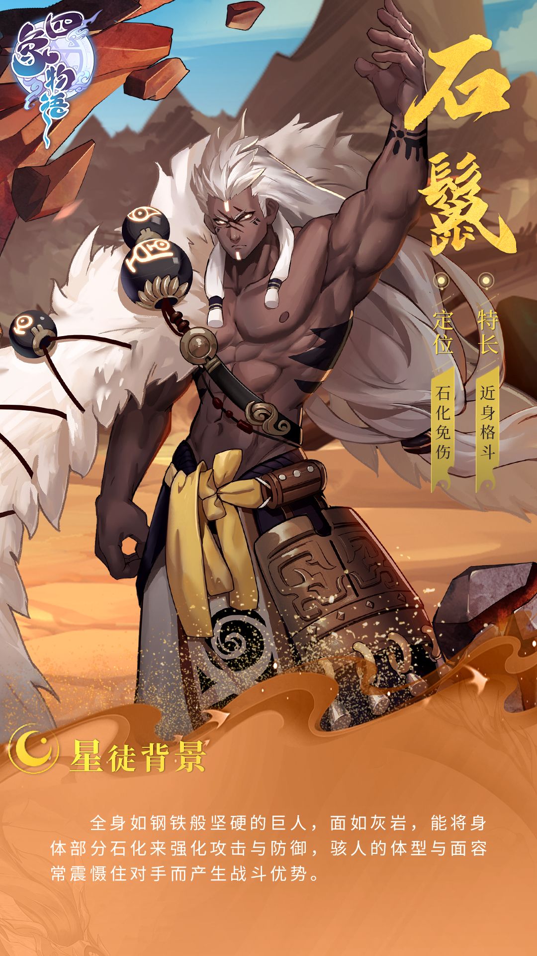 全身如钢铁般坚硬的巨人,面如灰岩,能将身体部分石化来强化攻击与防御,骇人的体型与面容常震慑住对手而产生战斗优势。