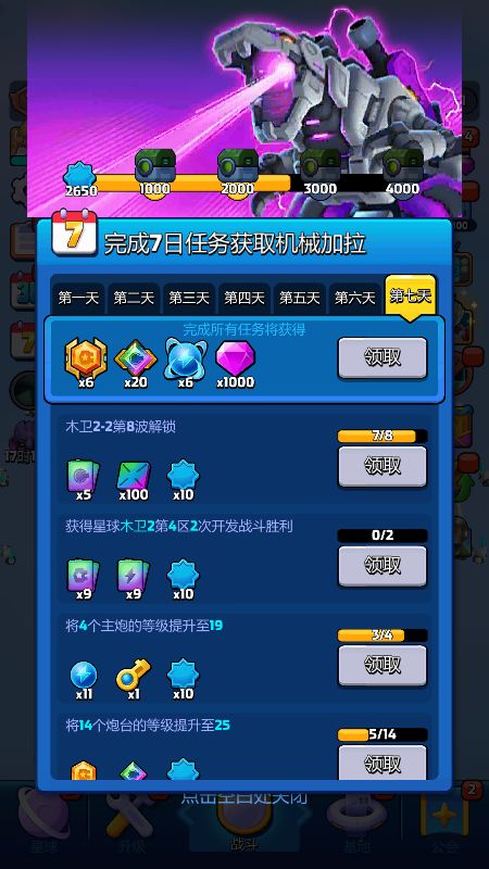 活动一:七日任务,多重福利领不停 登陆即可开启七日任务,完成每日开启的新任务,即可获赠宝石、各类道具材料,各类随机碎片等丰厚游戏奖励,不过期永久领,避免遗失福利的烦恼,完成所有七日任务还能免费领取珍稀泰坦-机械加拉,助你战力更上一层楼。