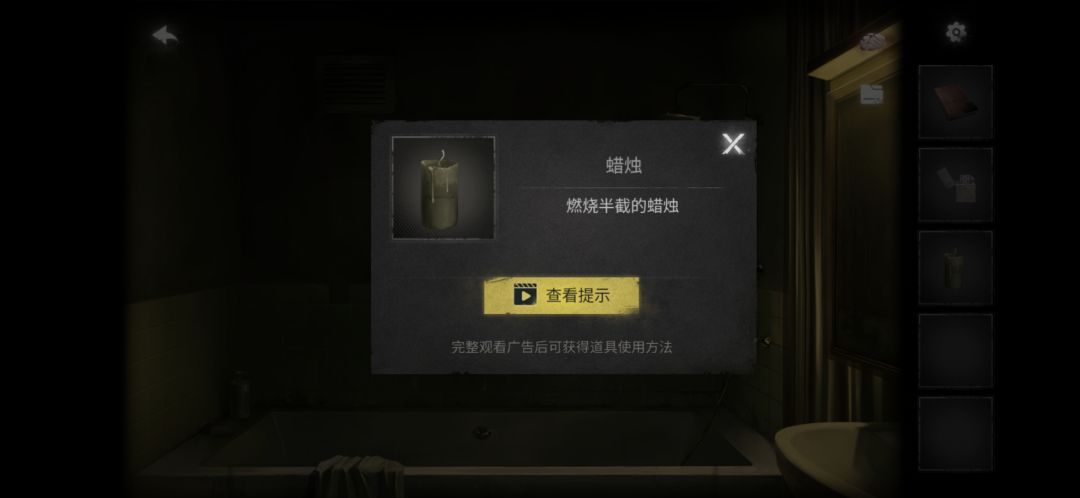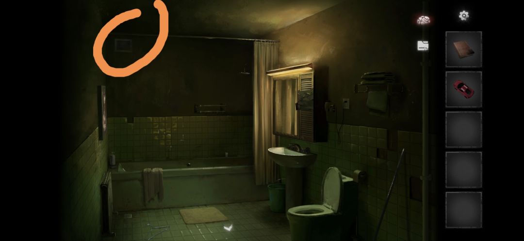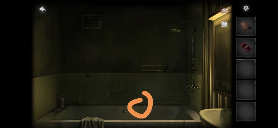 点击浴帘(有小高能注意),然后在浴缸边上捡到小车(没截到图大概在这个位置)和蜡烛