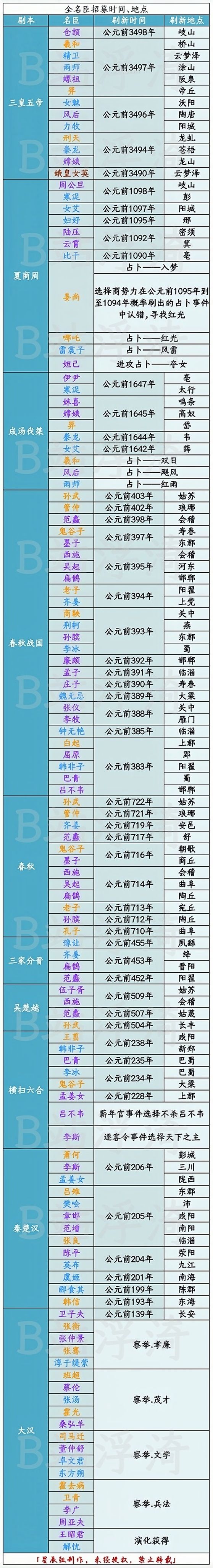 这里反馈名臣刷新延迟的王上要注意了:地图上最多同时存在四位名臣。当地图上存在四位名臣时,只有名臣被王上或其它势力招募或经过四座城市消失后才会刷新新的名臣。 为了方便王上招募名臣,我制作了一份名臣招募表格(更新时间2023-1-6),需要的王上自取。