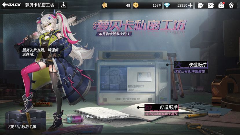 一、改造配件跟打造配件次数共用,每月5次