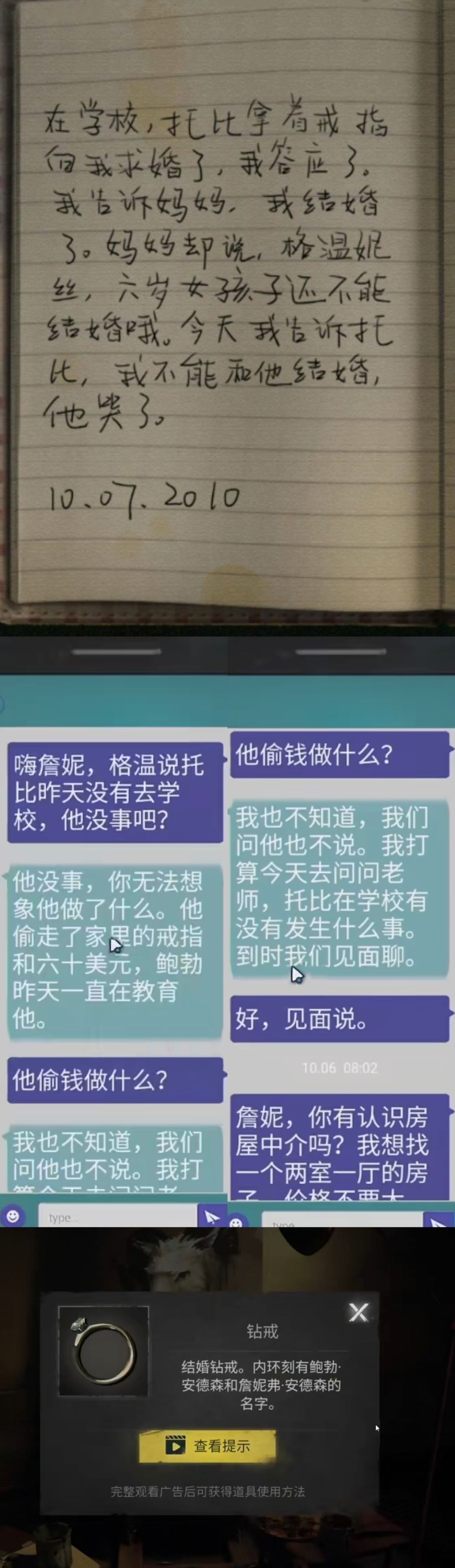 5:在密室的抽屉里找到了一枚钻戒 这个钻戒是鲍勃和詹妮弗(托比的父母)的结婚钻戒 也就是10月4日托比偷走了钻戒和60美元 向格温妮丝求婚
