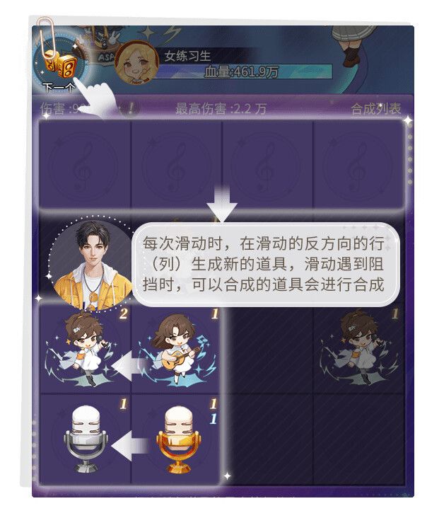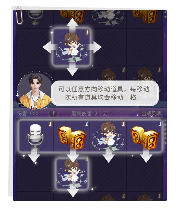 同种道具可以合成,阿SA和话筒可以合成,话筒和音响可以合成,阿SA和音响不能合成,不同颜色的音响之间不能合成,每个道具可合成的最高等级为8级。当阿SA和话筒合成时,阿SA会攻击小怪,在指定的回合内击败小怪可以获得胜利。