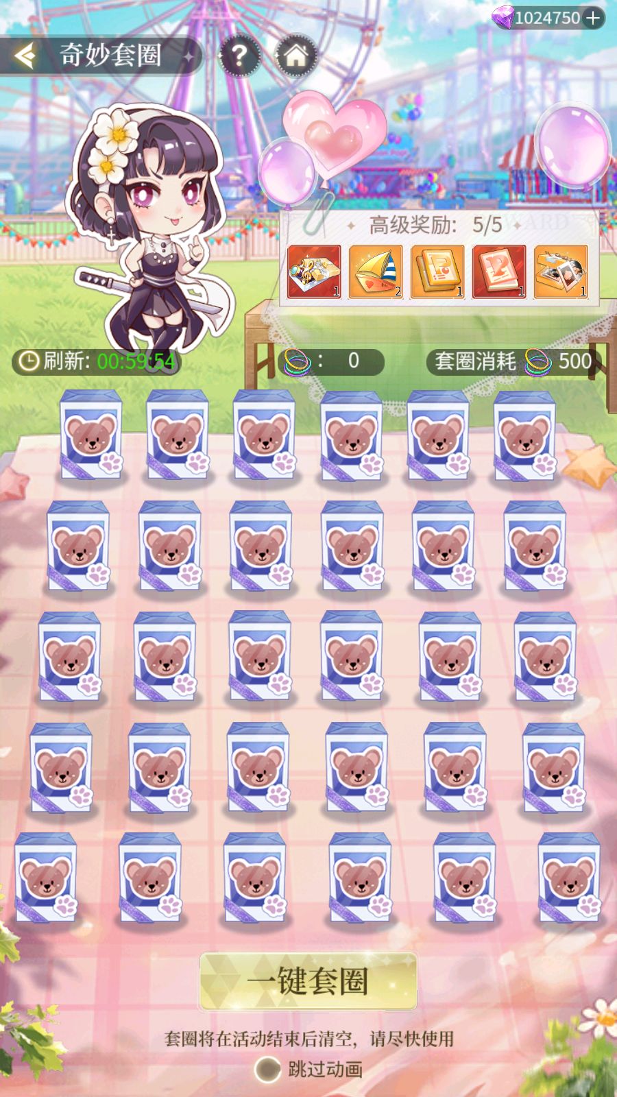 消耗套圈,即可套中摆放的熊熊礼盒,并获取熊熊礼盒里的道具奖励。