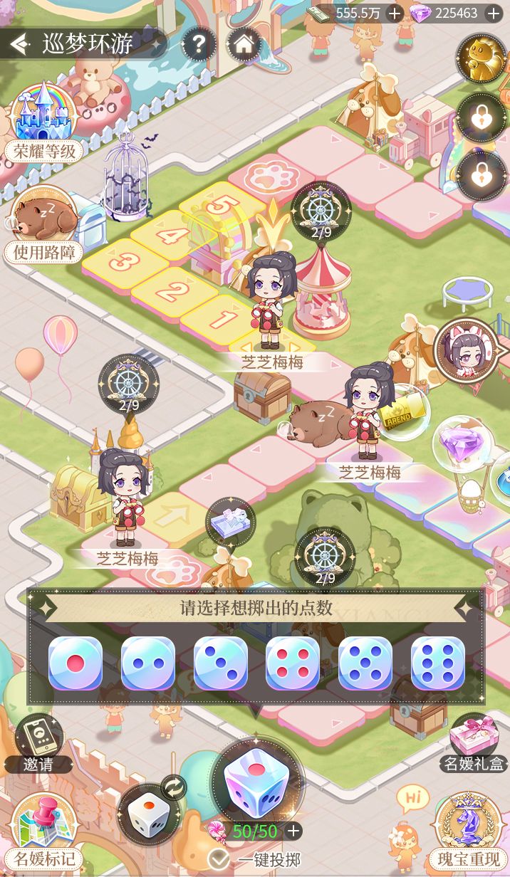 在游乐园地图,三小姐可以消耗体力,投掷骰子并前进对应步数,使用彩虹骰子,指定选择1~6之间的某个数字,作为下次投掷的点数。