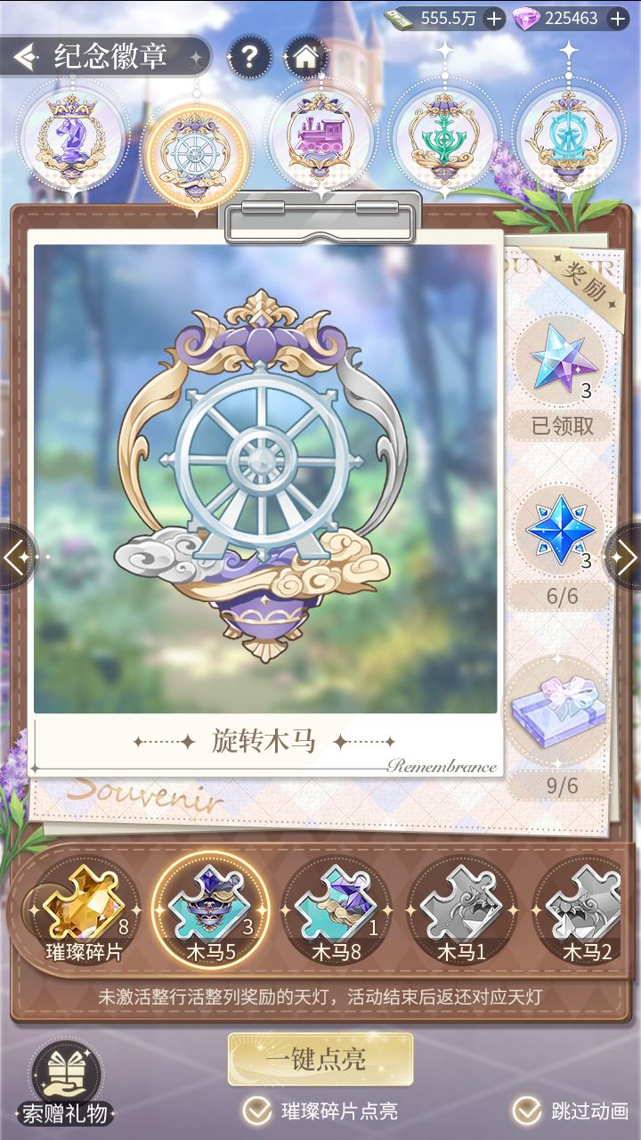 纪念徽章点亮奖励:每点亮3/6/9个纪念徽章碎片时,都可领取一份兑换奖励。当点亮完成9个纪念徽章碎片(即一整个纪念徽章)时,会刷新整个纪念徽章和所有点亮奖励。