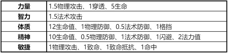 目前游戏中有五种基础属性,力量、智力、体质、精神以及敏捷,这五点基础属性往往1点代表多个不同的一级属性。