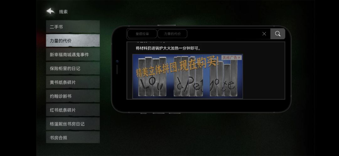 13.手机搜索(关键词见图),看到底下广告,获得线索5。然后去获得金牙。
