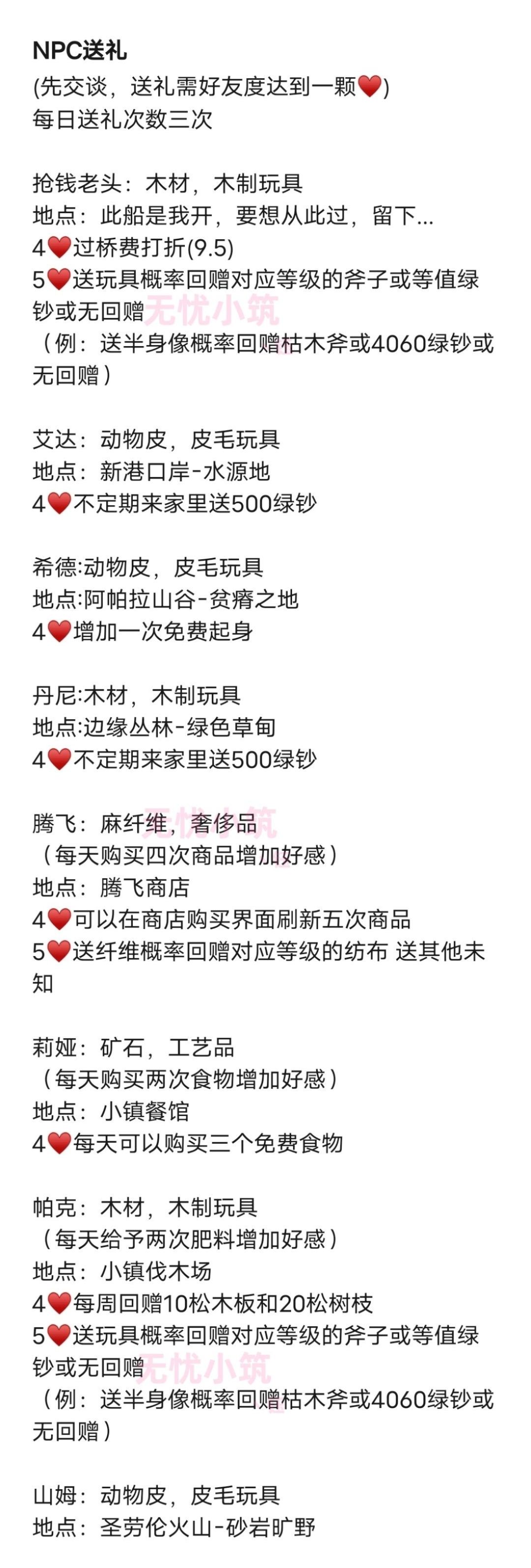 2、伐木场砍树,顺手捡数枝给手欠的帕克增加每日树木数量(收我的建材积极惨了,烦死了!!),送送玩具试试手气,具体NPC送礼有其它大佬帖子。