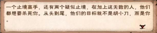 老道士来帮忙,但是修为不够,只能勉强拖住,主角要击败三波敌人离开洛阳到落霞,到落霞后,把锦囊给小刀,有天刀弟子设卡,说门主有令带小刀回去,说他惹了大祸要回去受罚,但是,众师兄弟还是放了小刀,在落霞镇里还有弟子来送盘缠。