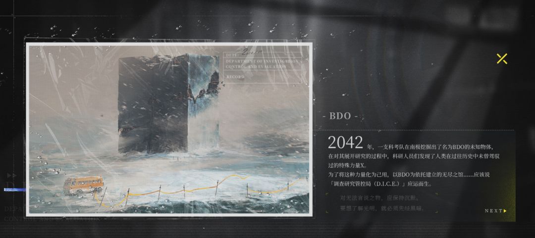 1.其中,官网资料显示为建立无尽之馆,报告页文件中写的则是获得,推测表达的意思是以BDO/001-1/无尽之馆 为依托,建立了D.I.C.E.