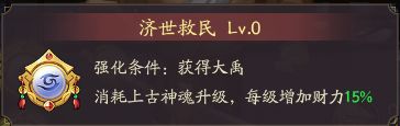 第二个技能,济世救民,每升1级会提升大禹百分之15的财力值,升级是要消耗10个上古神魂的,上古神魂就是兑换上古传说门客的道具10个可以换一个门客,应该先全部兑换激活百分之125之后在去看要不要升级这个技能,一级之增加百分之15少太多了。