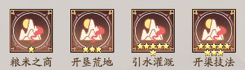 粮米之商、开垦荒地、引水灌溉和开渠技法都是增加田庄赚速的资质,这里的星级倍数是18倍,开渠技法是8星资质,派遣田庄的话会额外的增加80倍的赚钱,引水灌溉是6星资质派遣田庄也会增加10倍的赚钱。一共就是108倍的田庄赚速提升。