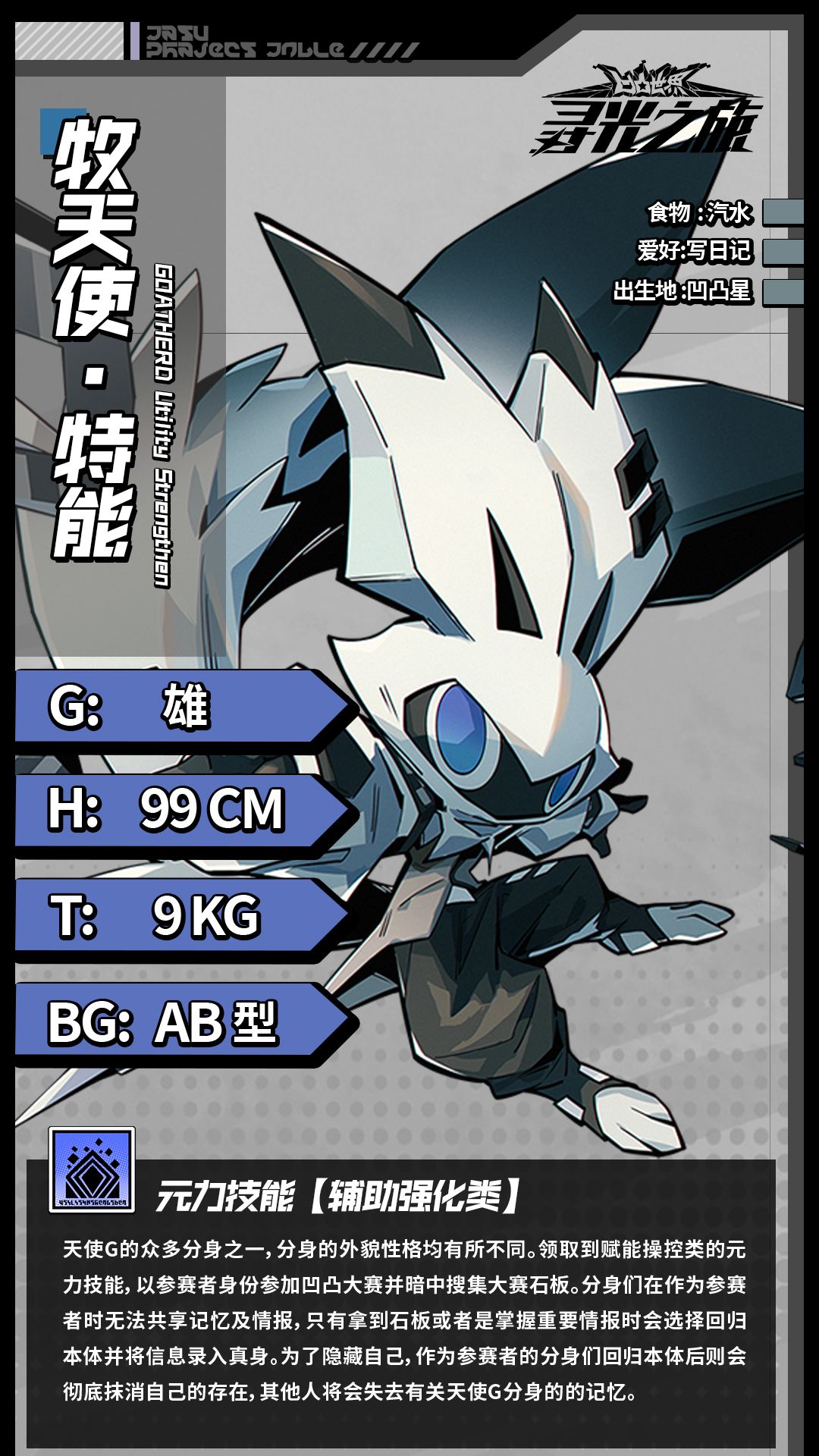 天使G的众多分身之一,分身的外貌性格均有所不同。领取到辅助强化类的元力技能,以参赛者身份参加凹凸大赛并暗中搜集大赛石板。分身们在作为参赛者时无法共享记忆及情报,只有拿到石板或者是掌握重要情报时会选择回归本体并将信息录入真身。为了隐藏自己,作为参赛者的分身们回归本体后则会彻底抹消自己的存在,其他人将会失去有关天使G分身的的记忆。