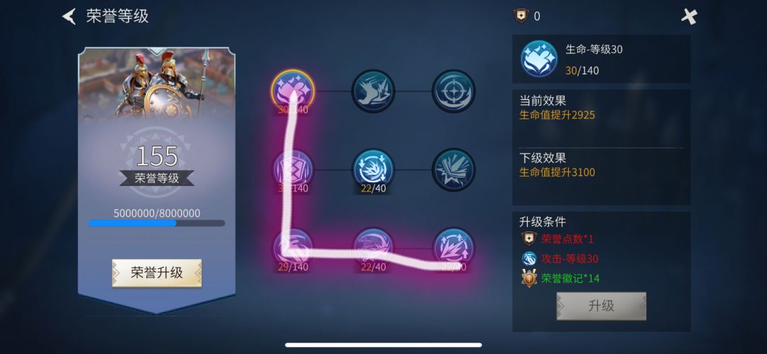 每级消耗一点荣誉点数(通过升级荣誉等级获得,每级一点),荣誉徽记道具,前置技能需要按要求顺序升级技能。