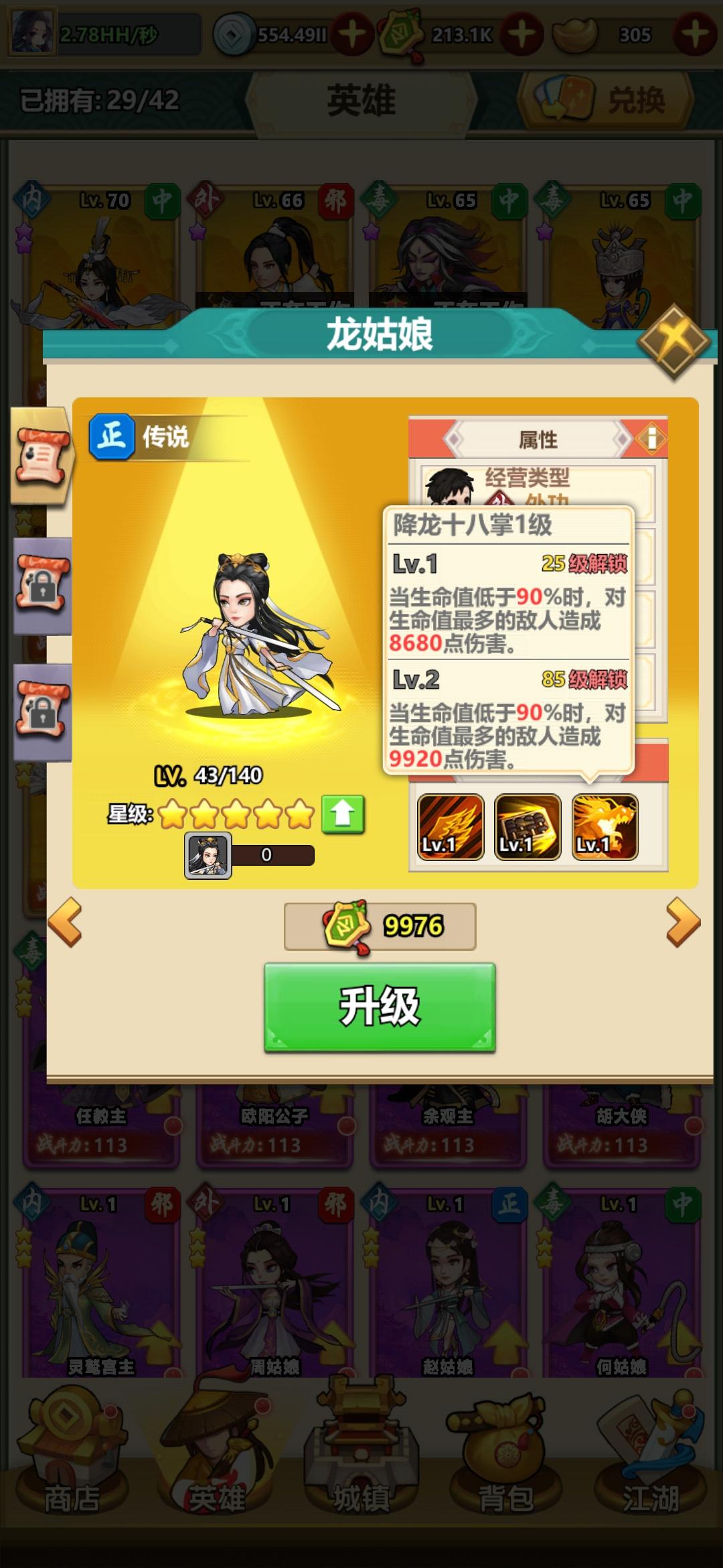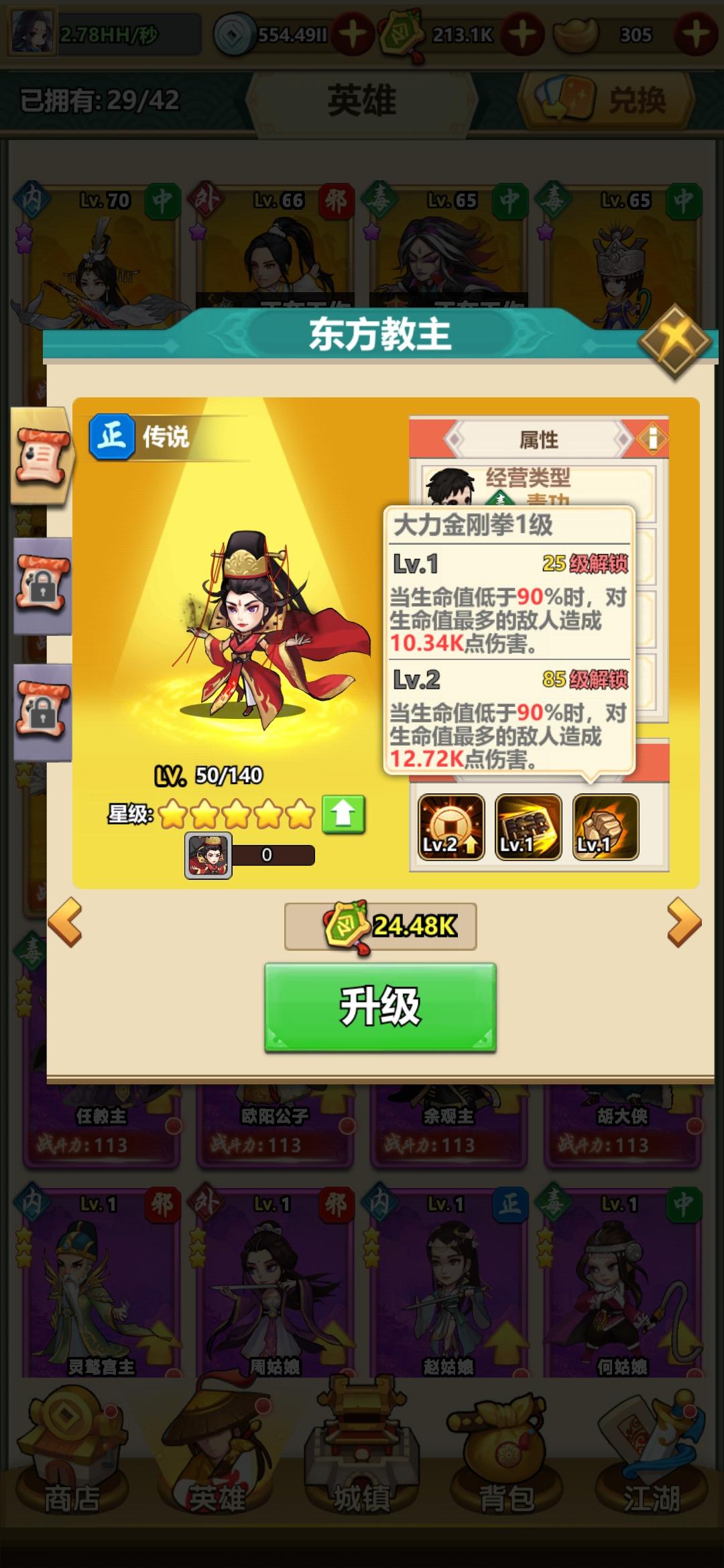 首先是从类型入手,因为要保证每个帮派最后都有相应的橙卡英雄占位,所以这3个英雄必须分别是外功,内功,以及毒功类型的英雄,而且呢,最好是华山,漕帮以及日月神教帮派的橙卡英雄,毕竟当前进度的关卡他们是主要生产力嘛,有了这2个条件,我们就可以筛选出以下几个英雄了