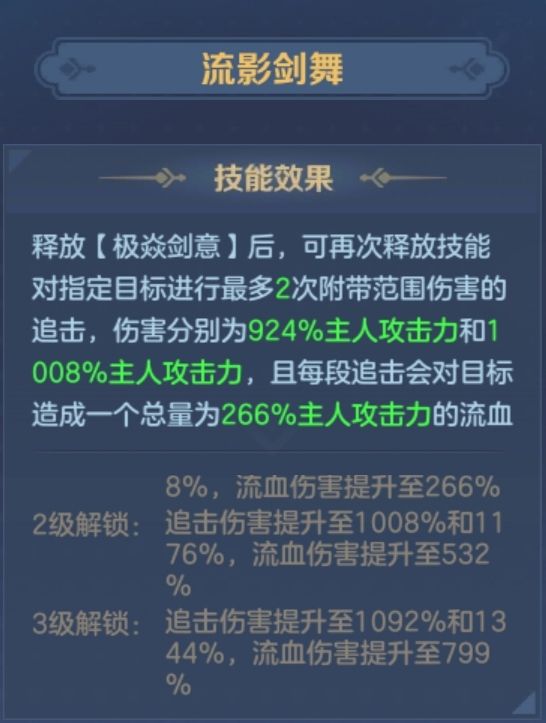 第三天赋流影剑舞:释放极焱剑意后,可再次释放对指定目标进行最多两次附带范围伤害的追击,且每段追击还会对目标造成百分比主人攻击力的流血效果,并不再对普攻进行强化。