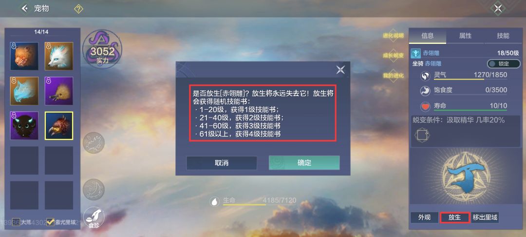 ①放生宠物:放生宠物可获得1本随机技能书(放生小伙伴无法获得技能书),放生不同等级区间的宠物可获得的技能书等级不同。