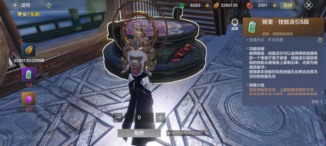 ● 主界面【功能轮盘-合成-造物-杂物】处可合成4级、5级骑宠·技能汲引。