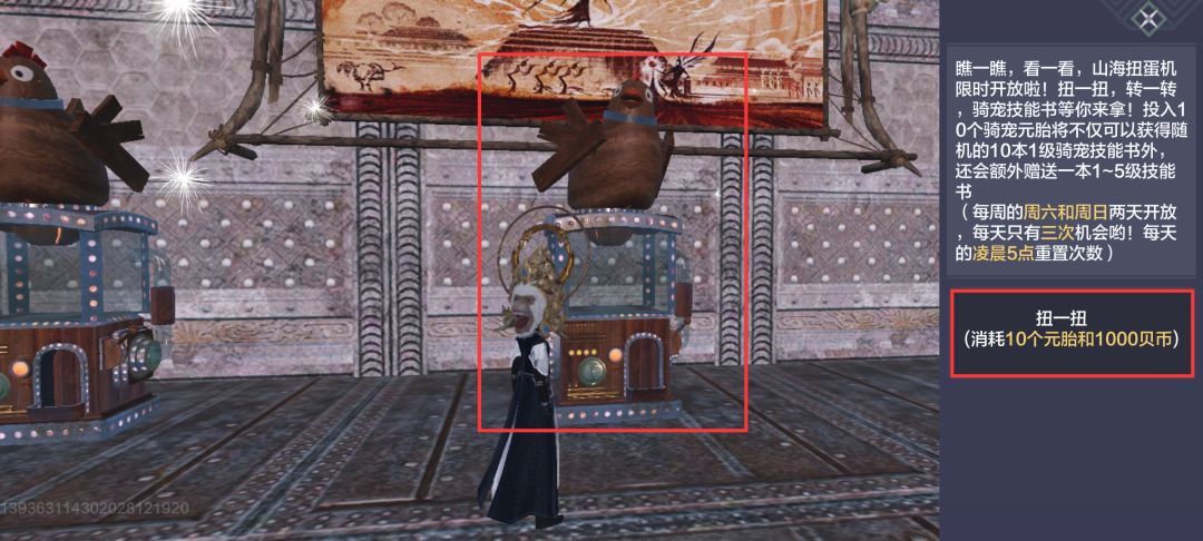 ③扭蛋机:将蓝色宠物元胎投入扭蛋机可获得10本1级技能书+随机等级的生命/攻击/防御技能书之一,扭蛋机位于主城【山海狂欢】建筑内,每个周末开放,每日限使用三次。