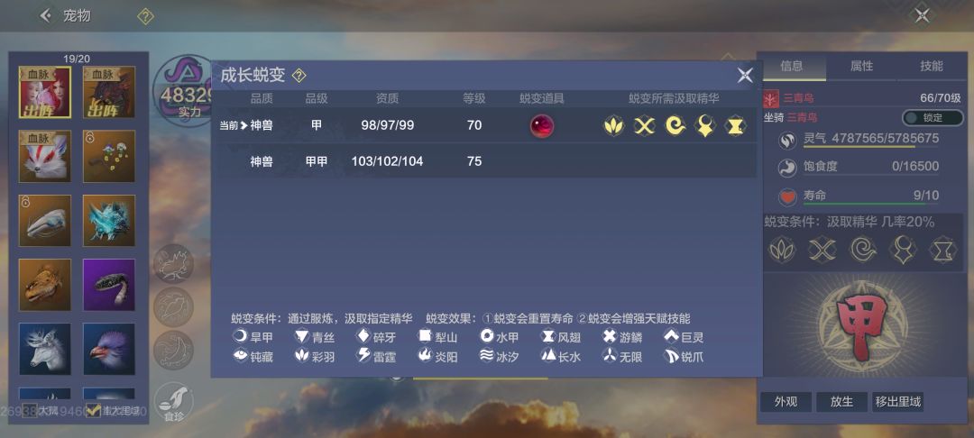 Tips:不同种类宠物需要的蜕变道具不同,都可通过神农鼎合成;蜕变需要一层层推进,无法一步登天,从普通品质立即进阶到三万年品质。