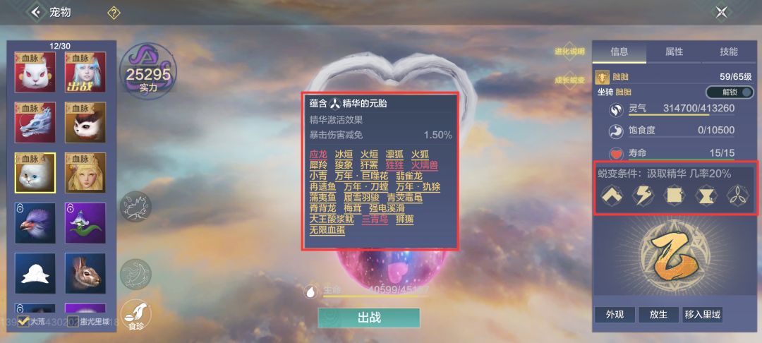 PS:具体需要什么精华,精华对应的宠物元胎是什么,都可以点击蜕变条件下的标志查看。成功汲取精华还可获得对应的属性效果,当所有精华都汲取了以后,即可开始蜕变。