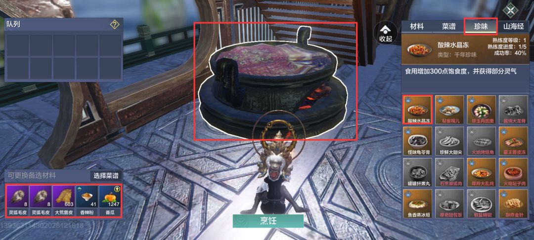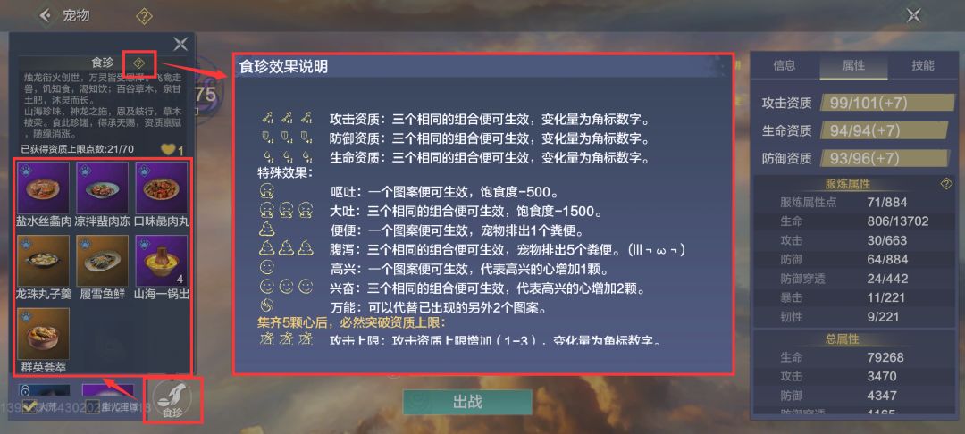 (2)珍味菜的获取:不同宠物喜欢的珍味菜不同,宠物只会吃喜欢的珍味,其主要制作材料是巨兽材料+普通食材。珍味菜分为百年、千年、万年三种不同品质,效果有细微区别。