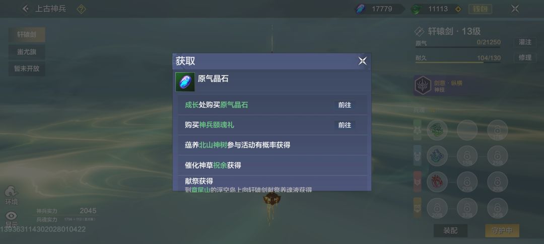 在北山西北部的章尾山浮空岛上向蚩尤旗献祭养魂液即可获得原气晶石(养魂液是熔炼低阶兵魂的产物),每周也有兑换上限。如果想要大量养魂液,推荐熔炼神树挑战获取的兵魂,或是利用汲魂柱自己造兵魂。