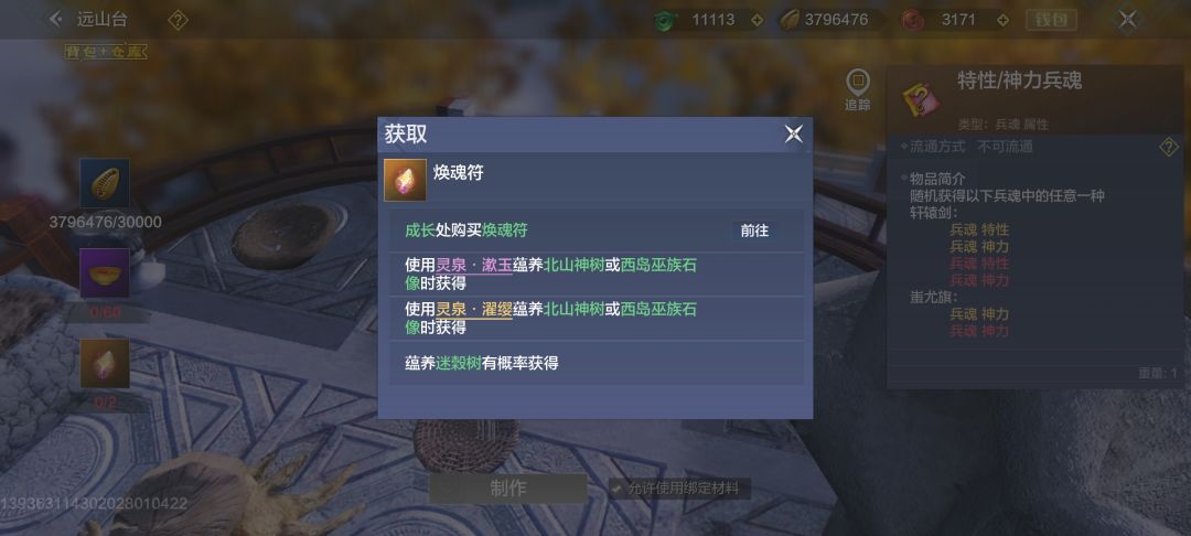PS:【远山台-临摹-合成】,选择兵魂,蚩尤旗的橙色属性、橙色自然、橙色和红色特性、橙色和红色神力兵魂都可以在远山台合成,需要使用贝币、颐魂液、焕魂符作为材料。