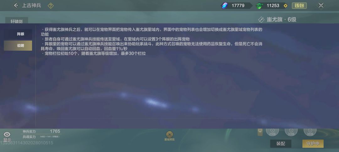 蚩尤旗等级提升会提升里域内的宠物栏位,解锁新的阵眼,召唤多只宠物共同作战。(宠物阵亡或蚩尤旗能量耗尽会收回宠物)