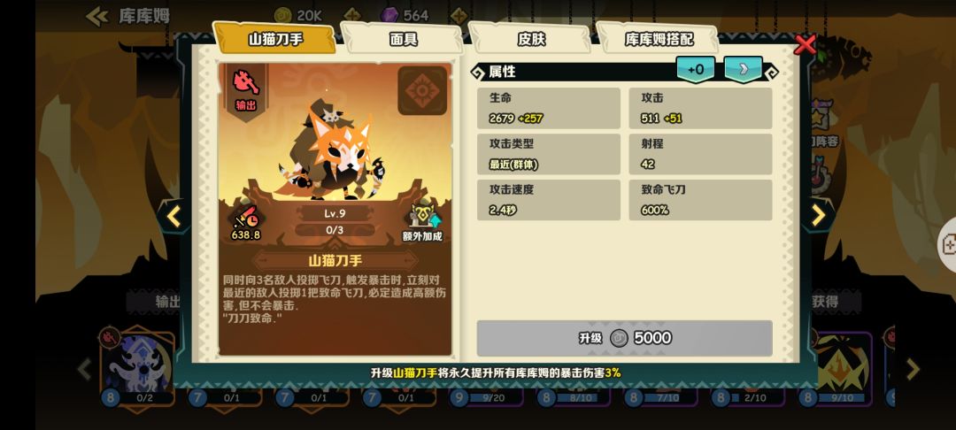 提升初始等级解锁新被动必定暴击,合成时使被鼓励的队友必定暴击!在一定时间内可以让山猫每次攻击都可打出额外伤害!可以和舞者合成触发!对山猫在短时间内的伤害有大幅提升!增强清场能力!