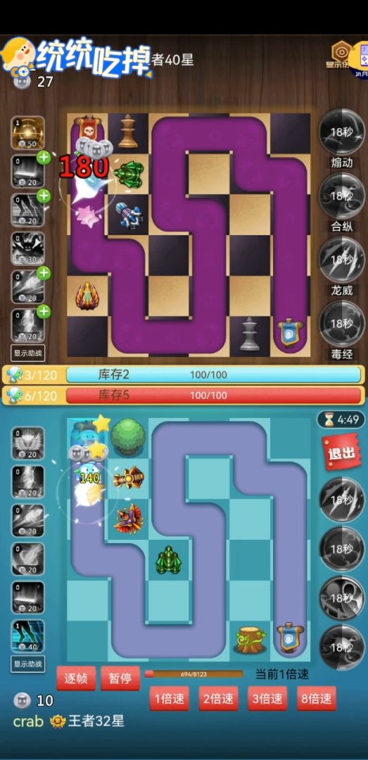 视频一中,游戏开始双方都采用拖怪(在我上个贴有简单提过拖怪的原理)策略,在对面第一次用毒经时,对面入场怪物40+,库存30+,而我方入场怪物18,库存10,对面第一次毒经清怪后,我方入场怪物和库存怪数量会急增,但我方库存怪急增到40-50+,产生不了几只boss,我方还有毒经龙威未使用,对我方暂无危险,此时局面从拖怪策略来看,我方有利,此时我方毒经清怪就能给对面产生大量BOSS,由于对面有暴富且积攒到一定金钱,我方求稳稍微点些防守技能且保留龙威,在对面第二波凶猛怪来袭时再使用龙威清怪,又能给对面产生可观的boss。可以结合以上说明,再去看看视频。