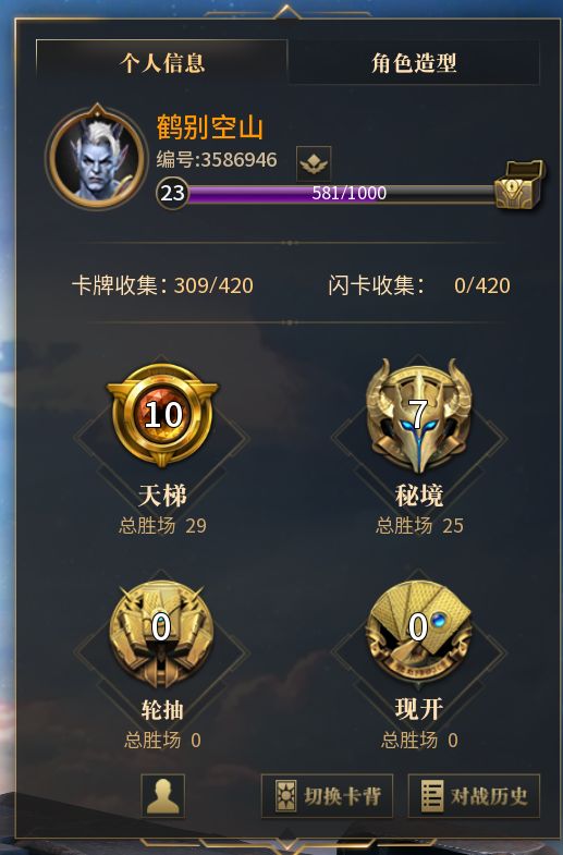 首先先上战绩,如果个人列表里这个统计胜场没错的话,那应该就是29-4,白银二之前一局没输,本来想全胜上黄金的,结果发现我想多了,可惜战绩截不到前面的战绩了,貌似只能看最近十场。输的局我记得很清楚,输了一局大公溜溜球,两局双黑的乌鸦拍脸,还有一局双蓝对面起手俩113一堆低费法术的天胡局。虽然还在新手村,但单看效率应该还算的上不错吧。