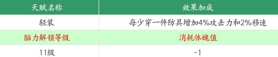 效果加成:在前期开荒时每位玩家的防具都是不齐全甚至没有,这就意味着装戴这个天赋在没有防具的情况下,伤害以及移动速度都是特别理想的,但是血量和防御也会特别低,有利有弊吧;