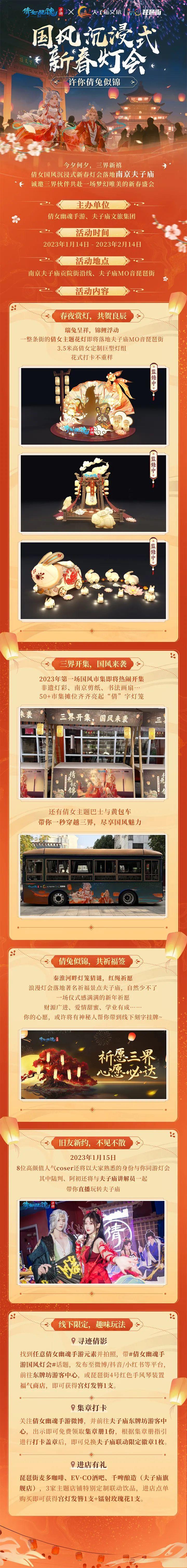 秦淮河畔看明灯千盏,灯火阑珊见倩影翩然。新春伊始,秦淮河畔,倩女幽魂手游携手南京夫子庙文化旅游集团,以2023年春节灯会为契机,为你开启一场国风沉浸式新春灯会!