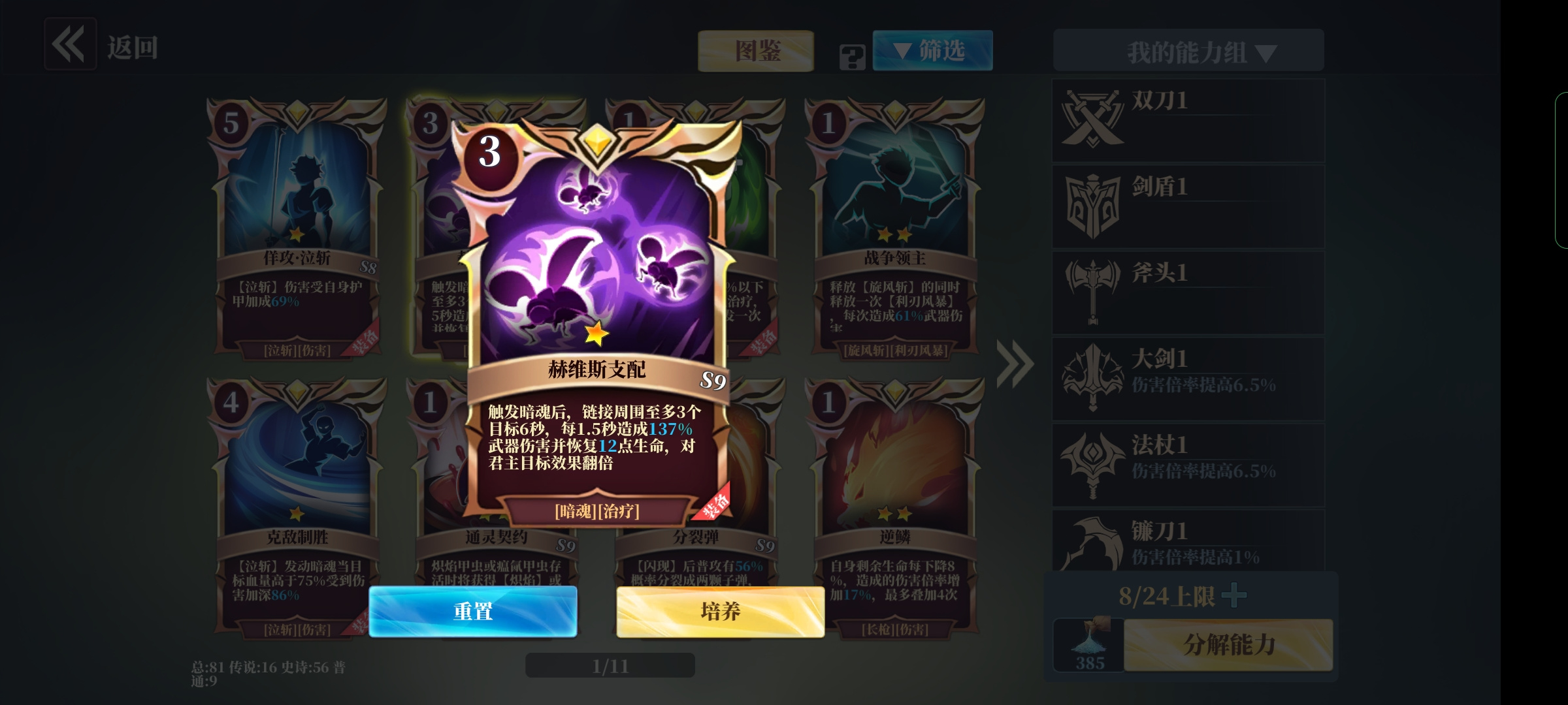 主要是打BOSS,装备双刀天赋,法盘依旧刺客大师,下坑可以顺时针转一下,左下速度光环,右下致命一击,右上黄黄黑施法加30%移速,技能带疾跑,不要说没什么伤害,活不下来谈什么伤害,然后暗魂状态一好过去就是一个泣斩,不要怕生存金卡帮你回血,嗑上药瓶血回的过来就把泣斩放了,然后疾跑跑,不要用烈斩,回血核心那张卡链接范围小容易断掉,加上各种加伤害的卡能磨不死?
