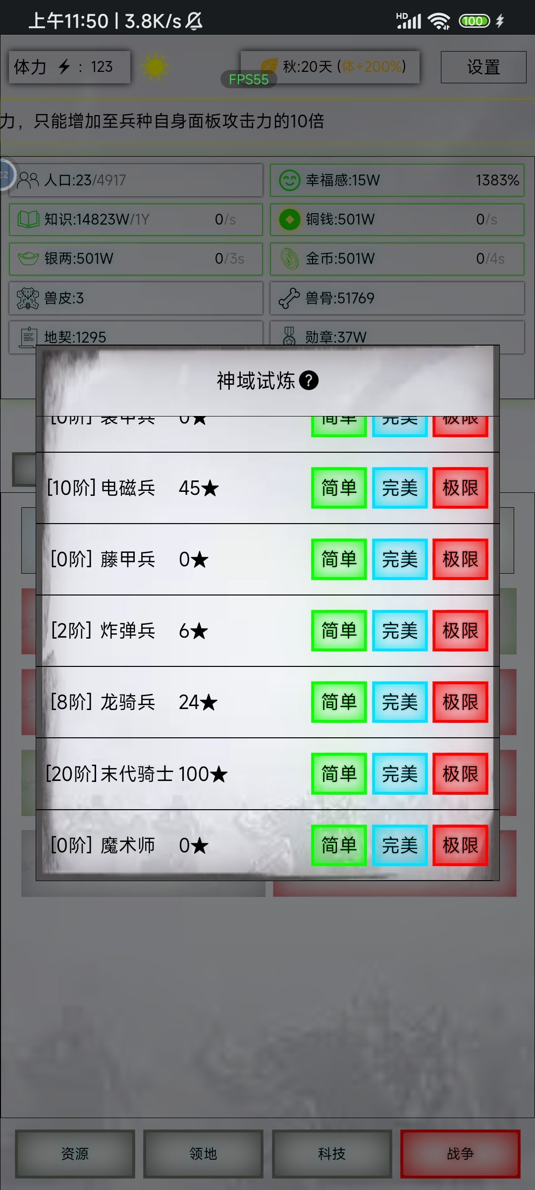 3. 末代攻击低,试炼一次要打很久,可以先打一波神,把其他兵力降下来,再来打末代的试炼,等试炼打完,其他兵种也招募的差不多了,可以合理利用时间,哈哈,时间管理大师。